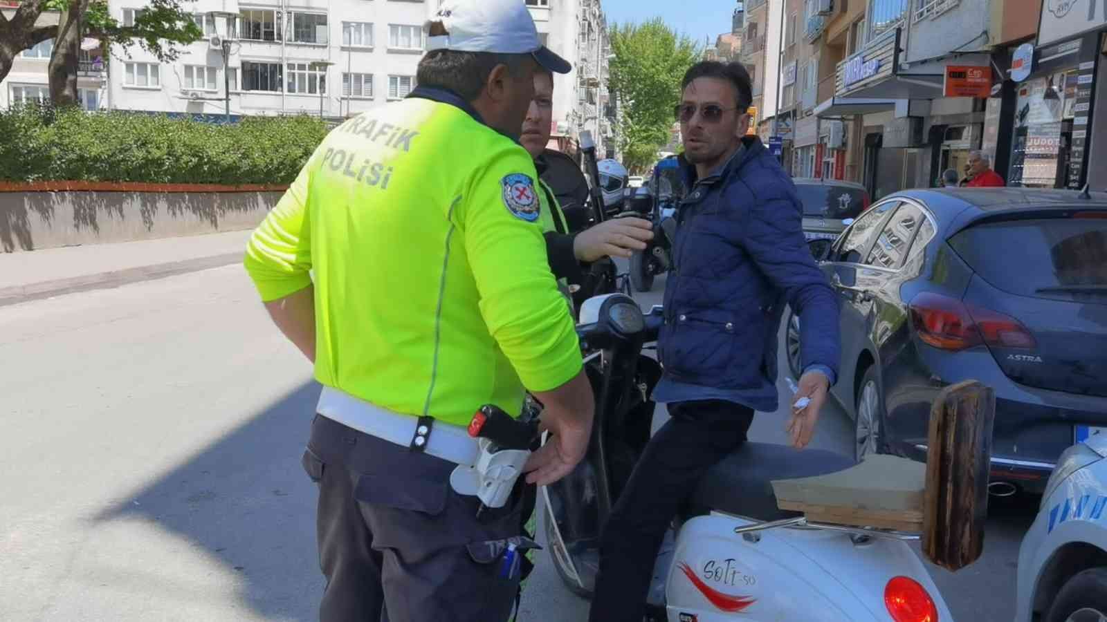 Bursa’nın İnegöl ilçesinde Emniyet Müdürlüğü Trafik ekipleri motosiklet sürücülerine yönelik uygulama başlattılar. Kask kullanmayan sürücülere cezai işlem uygulandı. Cezai işlem makbuzunu yırtıp atan sürücü Raşit I., polis ekiplerine tepki gösterip şov yaptı.