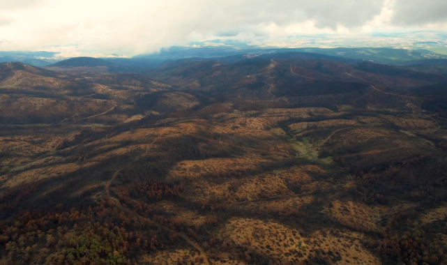 Bursa'da yaz ayında çıkan orman yangınlarında 953 hektarlık alan küle döndü. Bursa Orman Bölge Müdürlüğü ekipleri, hasar tespit çalışmalarının ardından yanmış ağaçları kaldırıyor ve 300 bin fidanla bölgenin yeniden yeşertilmesi için yoğun bir çalışma yürütüyor. Çalışmalar havadan da görüntülendi.