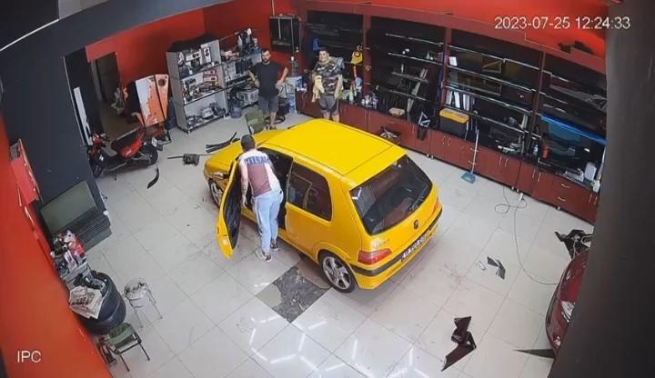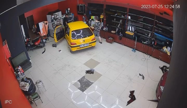 Merkez Osmangazi ilçesi Beşyol sanayi sitesi içerisinde bulunan oto tamirci dükkanına aracına bakım yaptırmak için gelen müşteri bir süre otomobilin yanında bekledi. Daha sonra direksiyon başına geçen sürücü, yanlışlıkla fren yerine gaza basınca önce dükkan sahibine, ardından dükkanın içindeki malzemelere çarpıp durdu. Herkes kısa süreli şok yaşarken, o anlar güvenlik kamerasına saniye saniye yansıdı.