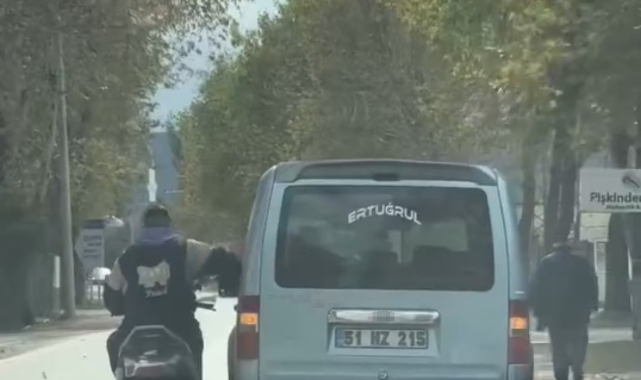 Bursa’da bir motosiklet sürücüsü, seyir halindeki arkadaşıyla sohbet etmek için bir elini ticari aracın camına yasladı, diğer eliyle ise motosikleti kullanmaya devam etti.