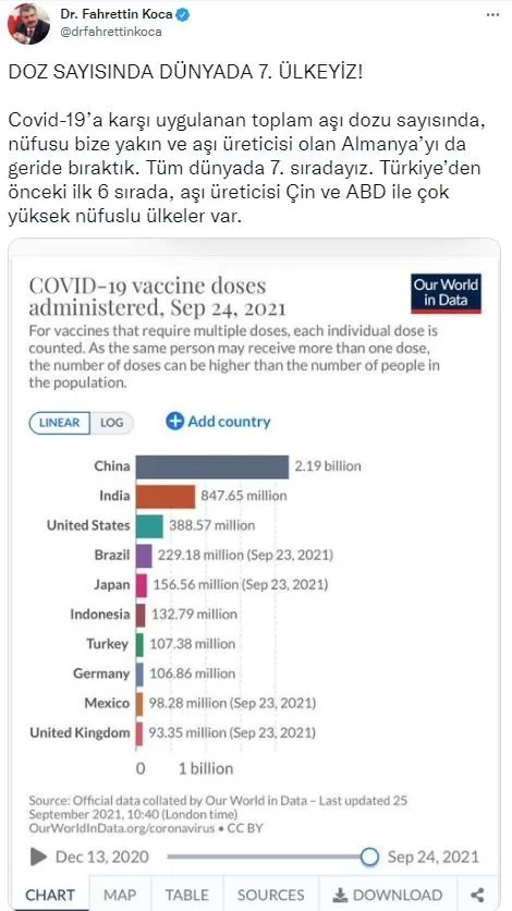 Sağlık Bakanı Fahrettin Koca: Covid-19'a karşı uygulanan toplam aşı dozu sayısında, nüfusu bize yakın ve aşı üreticisi olan Almanya'yı da geride bıraktık. Tüm dünyada 7. sıradayız. Türkiye'den önceki ilk 6 sırada, aşı üreticisi Çin ve ABD ile çok yüksek nüfuslu ülkeler var.