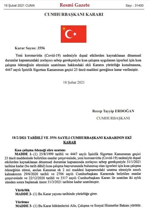 Başkan Recep Tayyip Erdoğan imzalı "Yeni Koronavirüs (Covid-19) Nedeniyle Dışsal Etkilerden Kaynaklanan Dönemsel Durumlar Kapsamındaki Zorlayıcı Sebep Gerekçesiyle Kısa Çalışma Uygulanan İş Yerleri İçin Kısa Çalışma Ödeneğinin Süresinin Uzatılması Hakkında Karar" Resmi Gazete'de yayımlanarak yürürlüğe girdi.