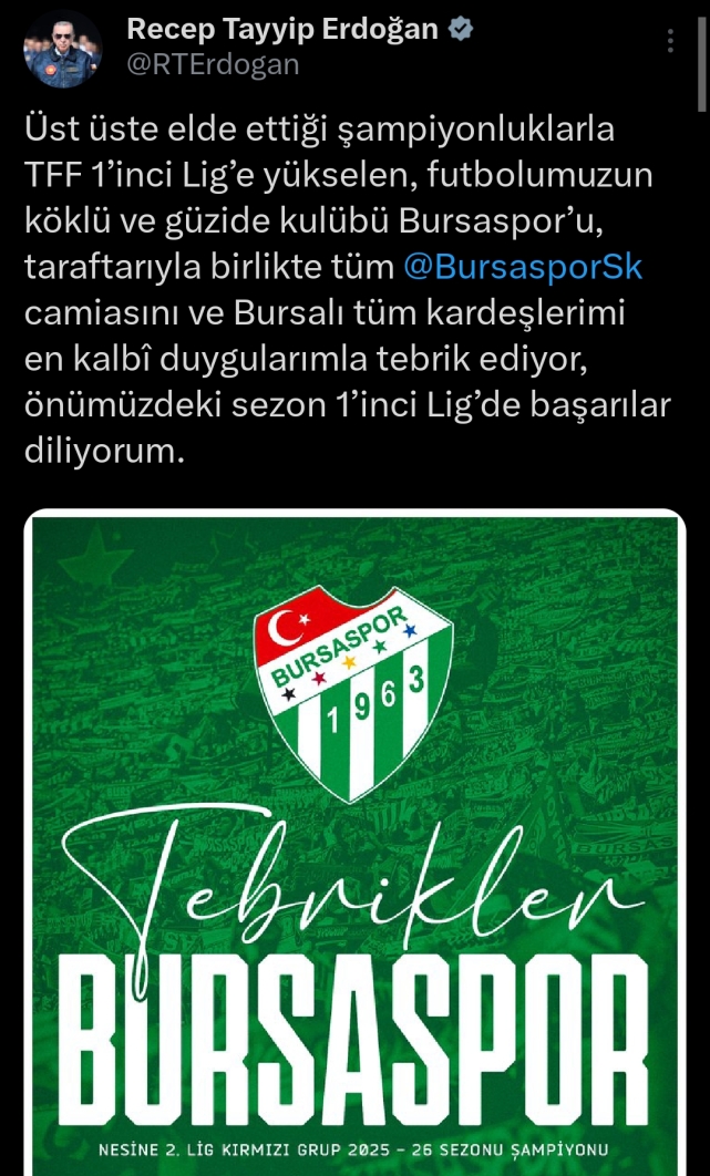 Cumhurbaşkanı Erdoğan, NSosyal hesabından paylaştığı tebrik mesajında şu ifadelere yer verdi:"Üst üste elde ettiği şampiyonluklarla TFF 1'inci Lig'e yükselen, futbolumuzun köklü ve güzide kulübü Bursaspor'u, taraftarıyla birlikte tüm Bursaspor camiasını ve Bursalı tüm kardeşlerimi en kalbi duygularımla tebrik ediyor, önümüzdeki sezon 1'inci Lig'de başarılar diliyorum."