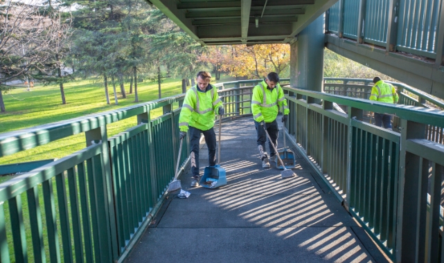 Bursa Büyükşehir Belediyesi Park ve Bahçeler Dairesi Başkanlığı Kent Estetiği Şube Müdürlüğü ekipleri, ana arterlerden meydanlara, yol kenarlarından alt geçitlere kadar kentin birçok farklı noktasında temizlik çalışmalarını 7/24 sürdürüyor. Hafta içi gece gündüz demeden kent genelinde çalışmalarını yapan ekipler, daha yaşanabilir, daha sağlıklı ve daha temiz bir kent için hafta sonu da yoğun mesai harcıyor. 9 süpürme aracı ve 3 artçı kamyonetle Ankara yolu, İzmir yolu, Mudanya yolu, İstanbul yolu, Lefkoşe Cadde ve Orhaneli Yolu gibi şehir içi ana arterlerde mekanik temizlik yapan ekipler, bat-çık içinde, kavşak kollarında, tüm yaya alt ve üst geçitlerde süpürme ve kaba çöp temizliği de yapıyor. Ana arterlerdeki yabani otlar, yollardaki çöpler ve atıklar toplanırken, duvar yazıları ve kâğıt afişleri de kaldırılıyor. 153 Ani müdahale Koza ekibi ise kentteki tüm araç kazaları, yağlanma, parça ve çeşitli olumsuzlukları giderme adına çalışmalarını 24 saat aralıksız sürdürüyor.