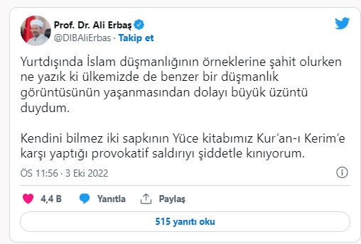 Erbaş Twitter hesabından yaptığı paylaşımda, “Yurtdışında İslam düşmanlığının örneklerine şahit olurken ne yazık ki ülkemizde de benzer bir düşmanlık görüntüsünün yaşanmasından dolayı büyük üzüntü duydum. Kendini bilmez iki sapkının Yüce kitabımız Kur’an-ı Kerim’e karşı yaptığı provokatif saldırıyı şiddetle kınıyorum” ifadelerini kullandı.