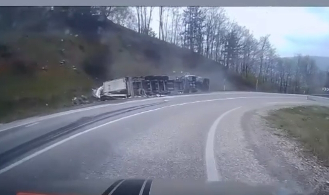 Bursa’nın İnegöl ilçesinde virajı alamayan su yüklü tırın devrilmesi sonucu meydana gelen trafik kazasında sürücü yaralandı. Kaza anı ise araç kamerasına saniye saniye yansıdı.