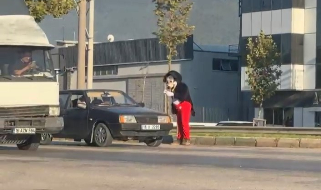 Bursa'da trafik lambalarında elinde mendillerle Miki Fare'yi görenler, gözlerine inanamadı.