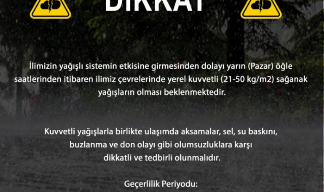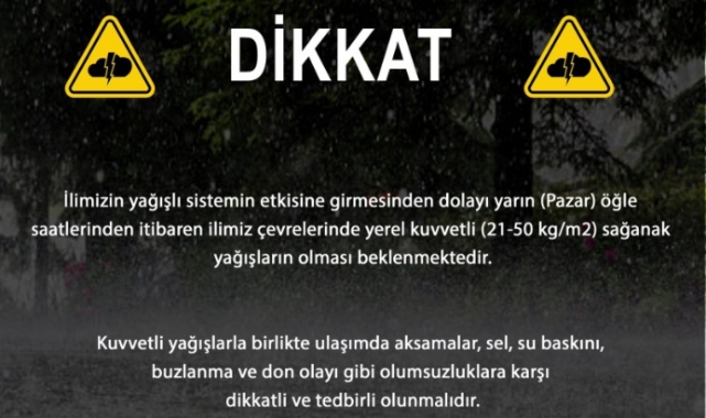 Yapılan açıklamada, aralıklı ve yerel olarak kuvvetli (21-50 kg/m²) sağanak ve gök gürültülü sağanak yağış beklendiği belirtildi. Kuvvetli yağışlarla birlikte sel, su baskını, yıldırım, heyelan ve ulaşımda aksamalar gibi olumsuzluklara karşı vatandaşların dikkatli ve tedbirli olmaları istendi.